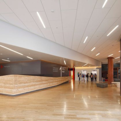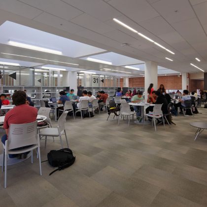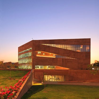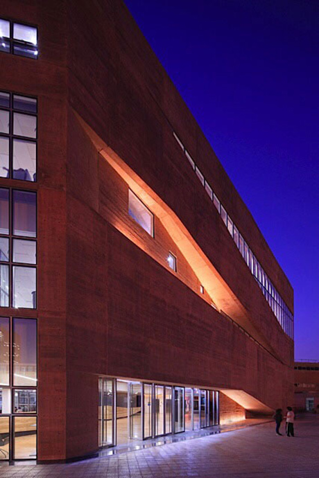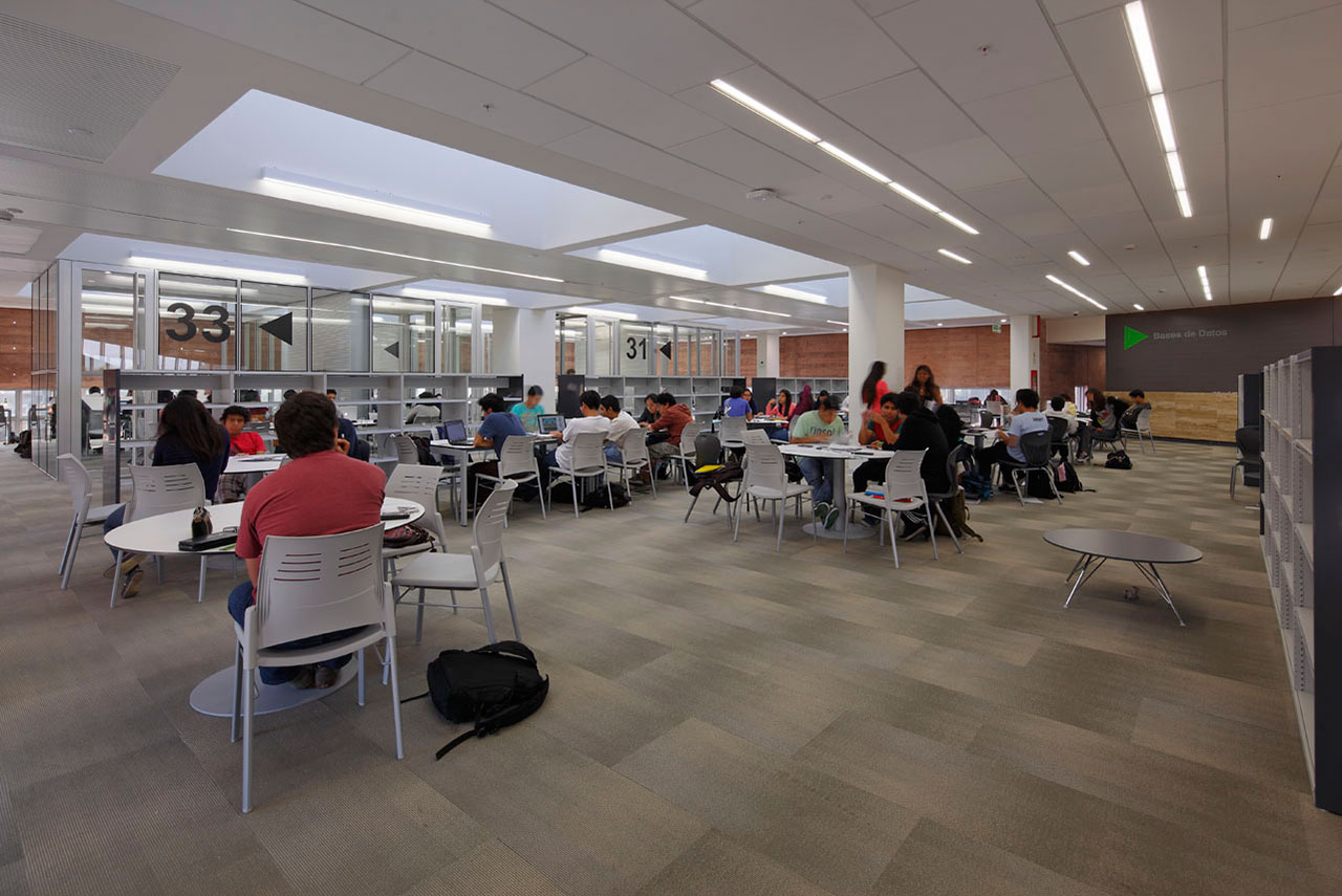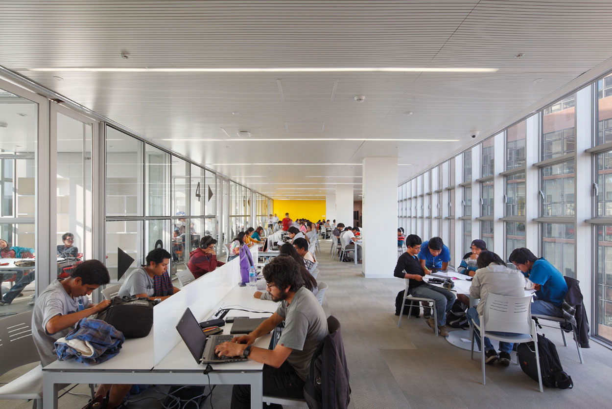 La iluminación de la Fachada principal se realza a través de sus perforaciones. Interiormente la modulación de la iluminación crea la posibilidad de crear distintos escenarios. En los pisos superiores se crean líneas de luz continuas que brindan una iluminación homogénea y de calidad.