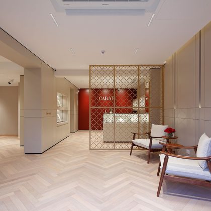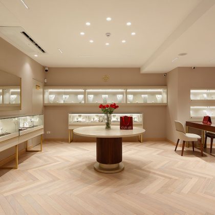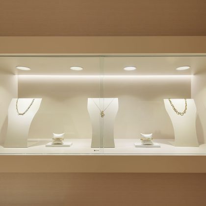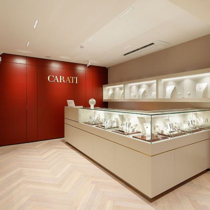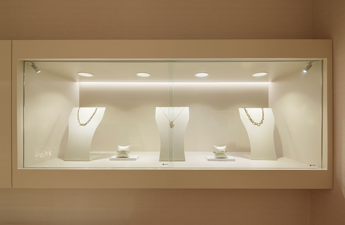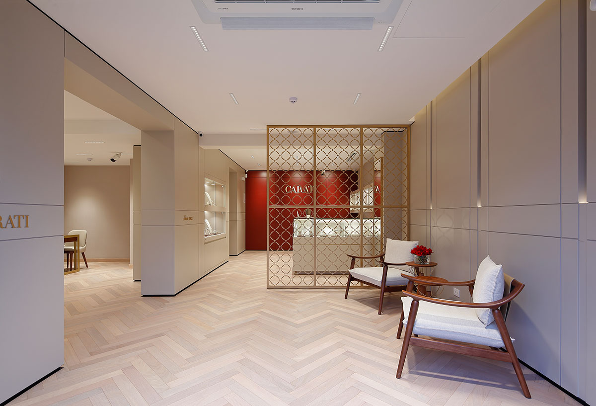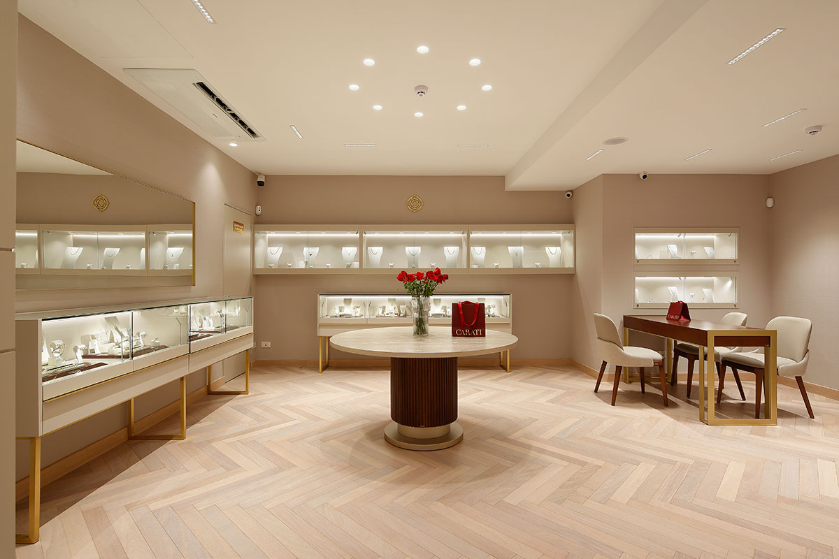 La joyería peruana CARATI, fundada en 1982, presenta su renovada tienda en Lima, un espacio cuyo diseño arquitectónico fusiona la herencia, elegancia y prestigio de la marca con una identidad contemporánea. El diseño de iluminación propuesto ofrece una solución dinámica que enriquece la experiencia de compra personalizada del cliente. La luz se integra armónicamente a la arquitectura interior mediante luminarias downlight con un grupo óptico controlado, que evita el deslumbramiento y asegura un alto nivel de confort visual durante todo el recorrido. Las vitrinas, situadas en los muros perimetrales, se convierten en puntos focales del espacio, iluminadas de forma adaptada según sus dimensiones. Se utilizan luminarias recesadas de escala mínima que orientan la mirada hacia los productos, lo que atrae y emociona al cliente.